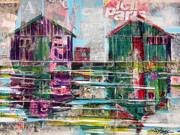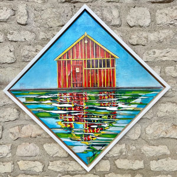 Diptyque: 2 tableaux de 80 x 80 (83 x 83 encadrés) représentant une cabane ("Dessus") et son reflet ("Dessous") .